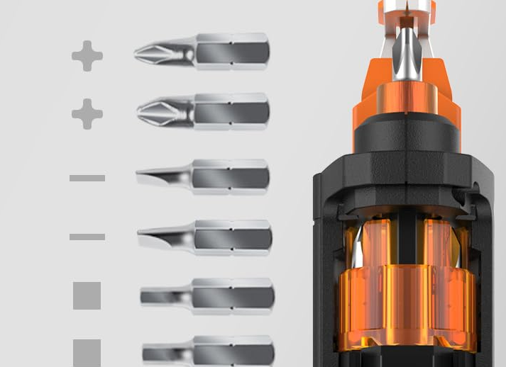 [Quick Bit Change] This semi-automatic screwdriver uses a sliding tool changer to switch between 6 drill bits. With a simple click, you can change from Phillips to flat head to your four favorite drill bits