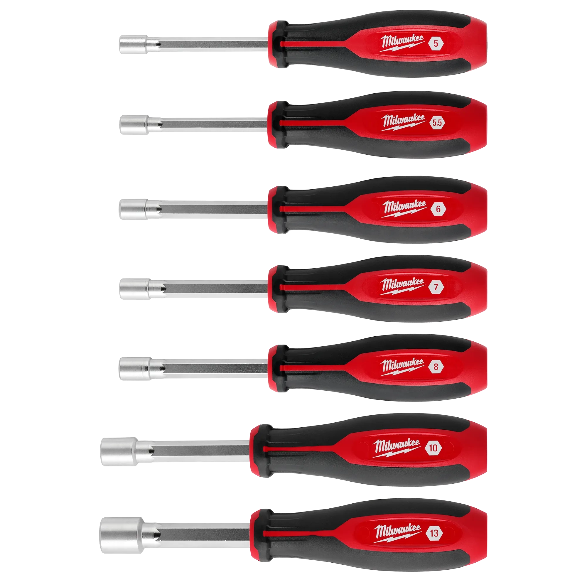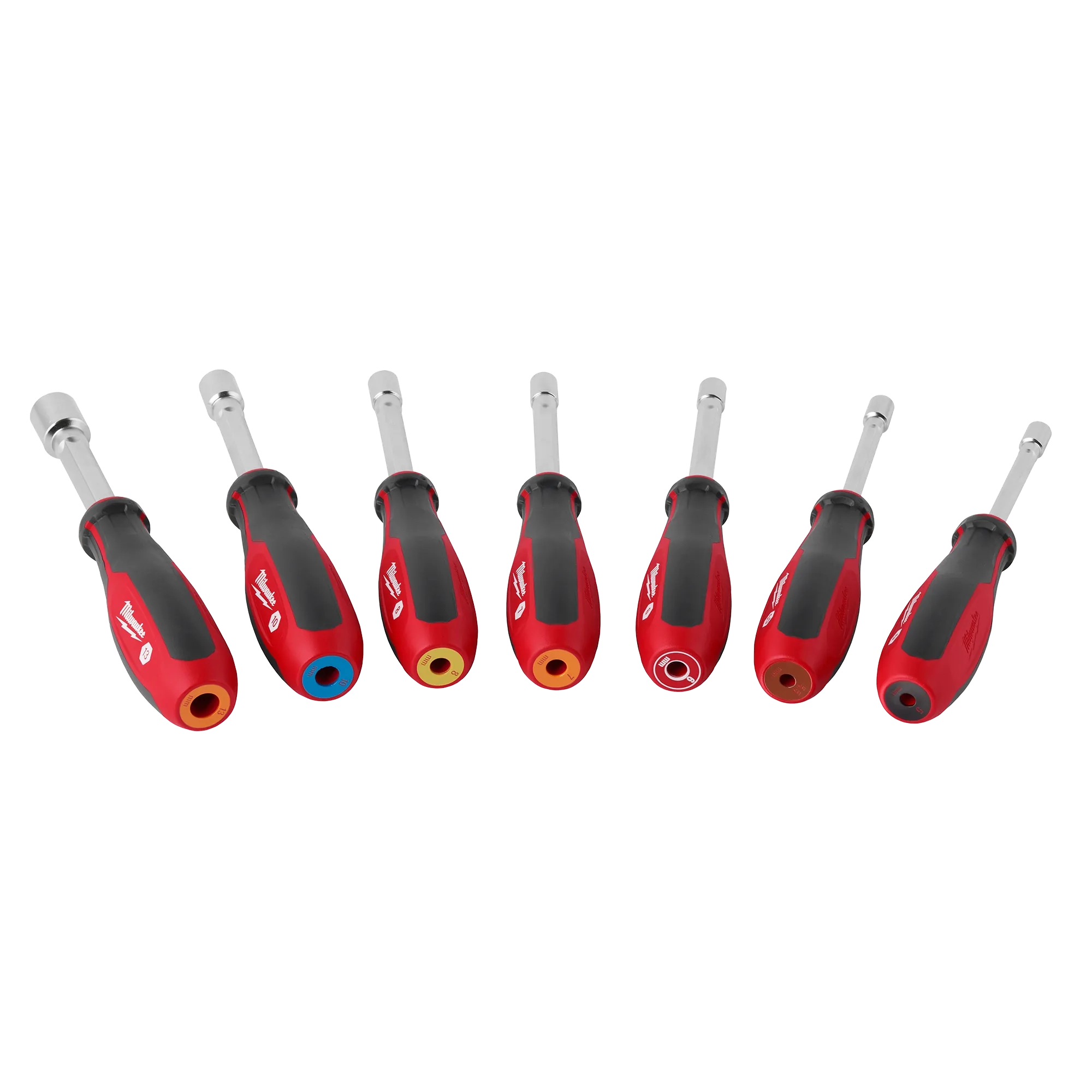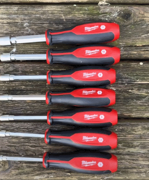 Our 7PC Metric Screwdiver set contains 5mm, 5.5mm, 6mm, 7mm, 8mm,10mm, and 13mm sizes. Our screwdrivers feature a shaft, which delivers unlimited depth in threaded rod and long bolt applications. The color-coded markings allow for easy size identification and the wrench-ready steel shanks provide additional leverage for tougher applications.