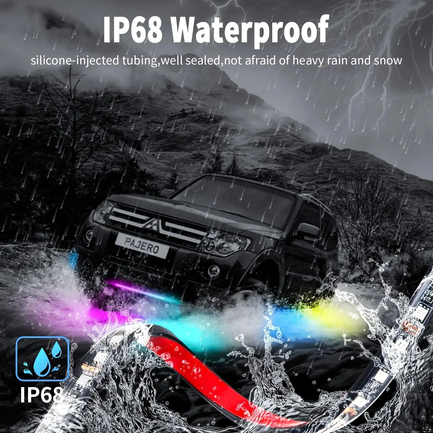 ✌【New Design&High Quality】2 line design with 4 led strip lights2 x 23 inch + 2 x 36 inch light strips(180 leds) using high quality smd 5050 rgb led.meelooks led lights for car,with ip68 waterproof and silicone material which can insure the car led light work normal and safe even on bad weather.low-power design and no pollution,you don't have to worry about energy consumption.