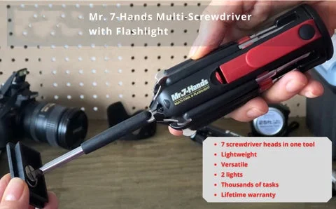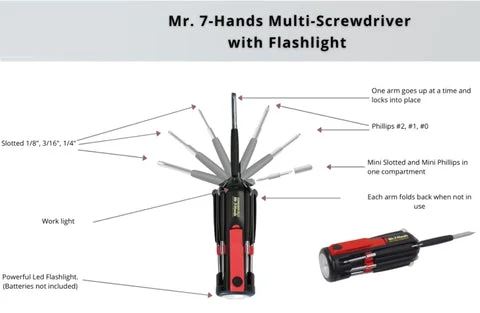 • 8 SCREWDRIVER TIPS IN ONE HANDY TOOL: Mr. 7-hands comes with eight most needed screwdriver tips. Never misplace screwdriver bits again with this unique patented folding arm design