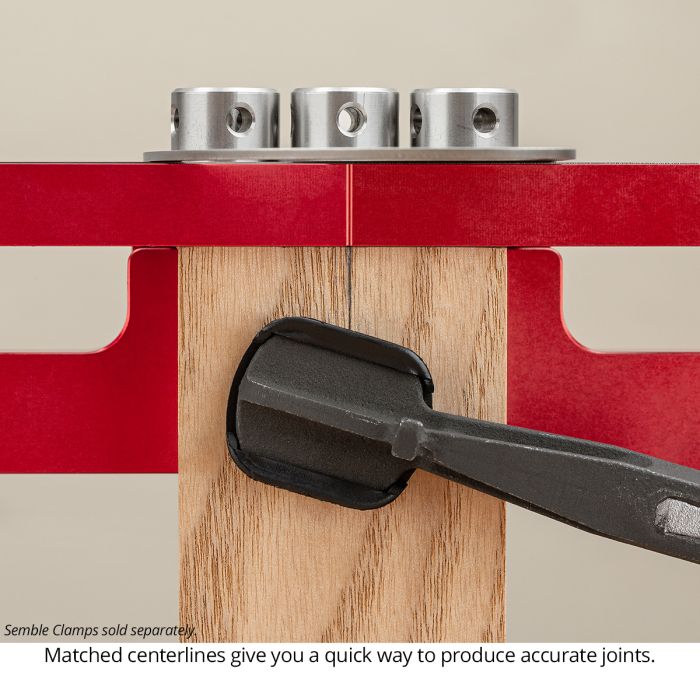 The easiest way to ue Cam-A-line utlizes the engraved centerines,just clamp your two boards together exactly where you wanthem. trike a line across the joint AliarCam-A-line's engraved centerine with the marks on each piece and dril your joint. The holes wiline up perfectly and create a jointhat rivals loose tenon or mortise andtenon joints for strength and durability, You can use the same process for miter joints, too.