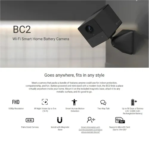 Meet a camera that packs a bundle of features anyone could use for indoor protection, companionship, and fun. Battery-powered and mini-sized with a modern look, the BC2 finds a place virtually anywhere inside your home. Mount it on the included magnetic base, attach it to any metallic surface, and it’s good to go.