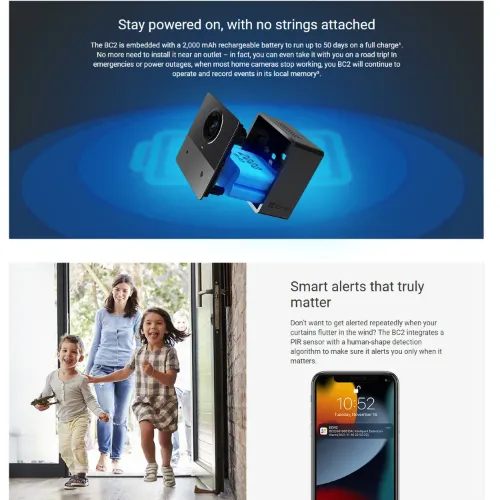The BC2 is embedded with a 2,000 mAh rechargeable battery to run up to 50 days on a full charge¹. No more need to install it near an outlet – in fact, you can even take it with you on a road trip! In emergencies or power outages, when most home cameras stop working, you BC2 will continue to operate and record events in its local memory³.