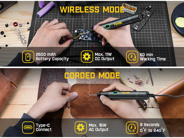 With the powerful built-in 2600mAh battery in wireless mode, the maximum DC Output is 11 W for up to 60 minutes at 840°F (450°C). Its small size is not bound by space, and maintenance work can be carried out anywhere. In wired mode, the maximum AC Output is 16W. It can be powered by a charger or mobile power supply with a Type-C port.