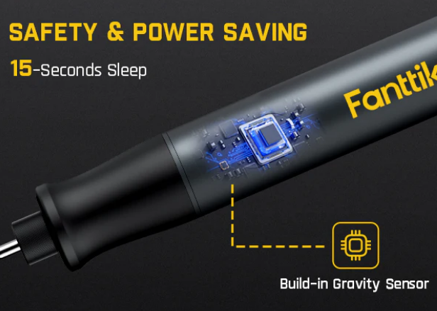After powered on, the soldering iron stand still for 15 seconds will enter sleep mode. Fanttik T1 MAX will automatically restart to heat up to the temperature you set when picking it up again. NOTE: The red light will flash when heating, while the green light is always on when heating is finished.