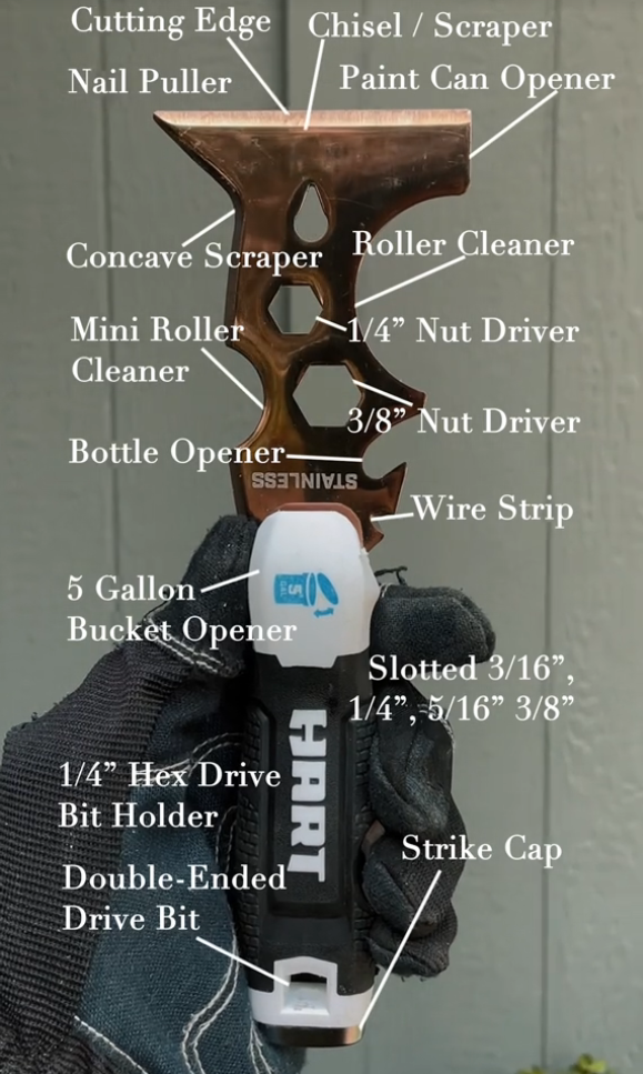 A painter's multi-tool can be one of the most time-saving tools in your tool bag. The HART 19-in-1 Multi-Tool is a great example. It's chock-full of useful tools like a nail puller, chisel/scraper, bottle opener, wire stripper, 4 slotted screwdrivers, cutting blade, concave scraper, 2 nut drivers, 5-gallon bucket opener, hex drive bit holder, paint can opener, roller cleaner, double-ended drive drill, and even a mini roller cleaner.